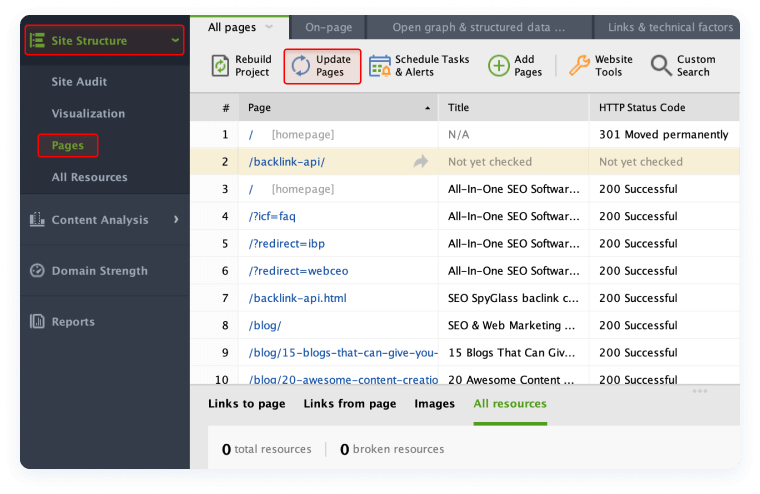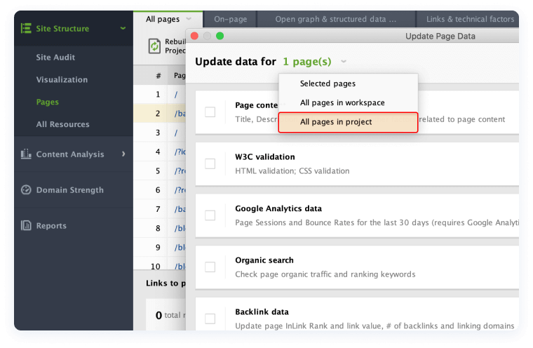 Open your project in WebSite Auditor, go to the Pages submodule, and hit