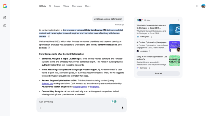 AI content optimization bridges the gap between search intent and AI interpretation. It’s not about writing for machines — it’s about removing friction so machines can confidently surface your content to humans.