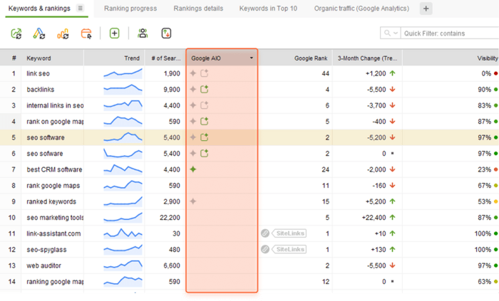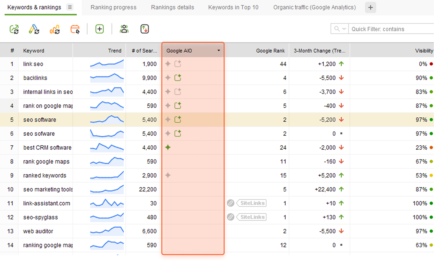 AIO Mentions and AIO Rank icons appear whenever a keyword triggers Google’s AI Overview.