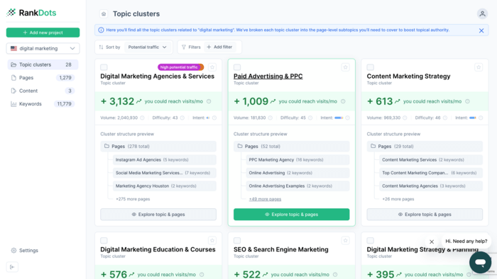 By grouping related queries into coherent topic clusters and showing how they connect, RankDots helps teams see whether their content actually supports a topic or just touches it superficially. This makes it easier to spot real gaps: missing subtopics, underdeveloped angles, or pages that should exist but don’t.