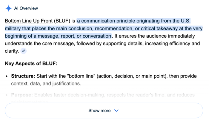 BLUF (Bottom Line Up Front) is one of the most reliable patterns for AI extraction.
