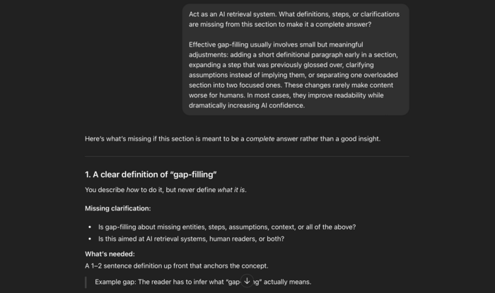 Effective gap-filling usually involves small but meaningful adjustments: adding a short definitional paragraph early in a section, expanding a step that was previously glossed over, clarifying assumptions instead of implying them, or separating one overloaded section into two focused ones. These changes rarely make content worse for humans. In most cases, they improve readability while dramatically increasing AI confidence.