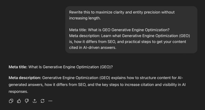 You can also paste your draft title and meta description and prompt: “Rewrite this to maximize clarity and entity precision without increasing length.”