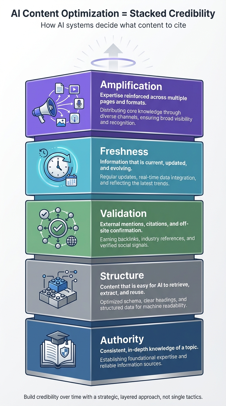 Think of AI content optimization as stacking credibility layers:
