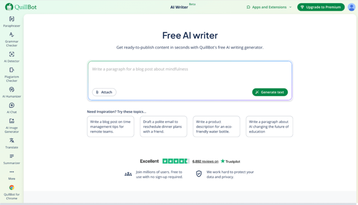QuillBot’s AI Writer is a prompt-based writing generator that helps you produce ready-to-publish drafts quickly. It’s free to use (no sign-up required) and can generate content types such as blog posts, emails, product descriptions, and more.