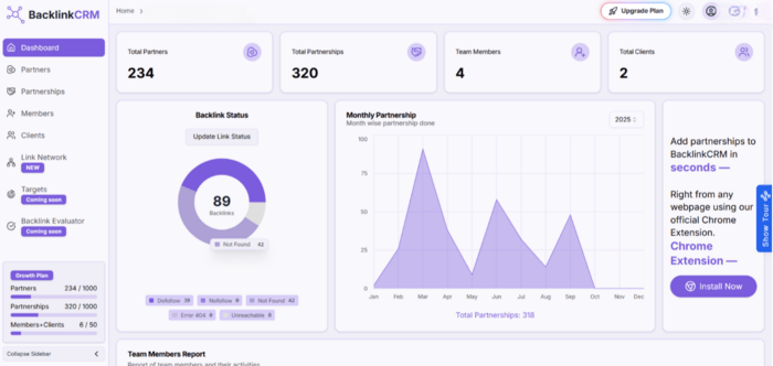 You can track who owes you a link, monitor live statuses like do-follow, no-follow, broken, or inactive, and manage all your partnerships from a single dashboard.