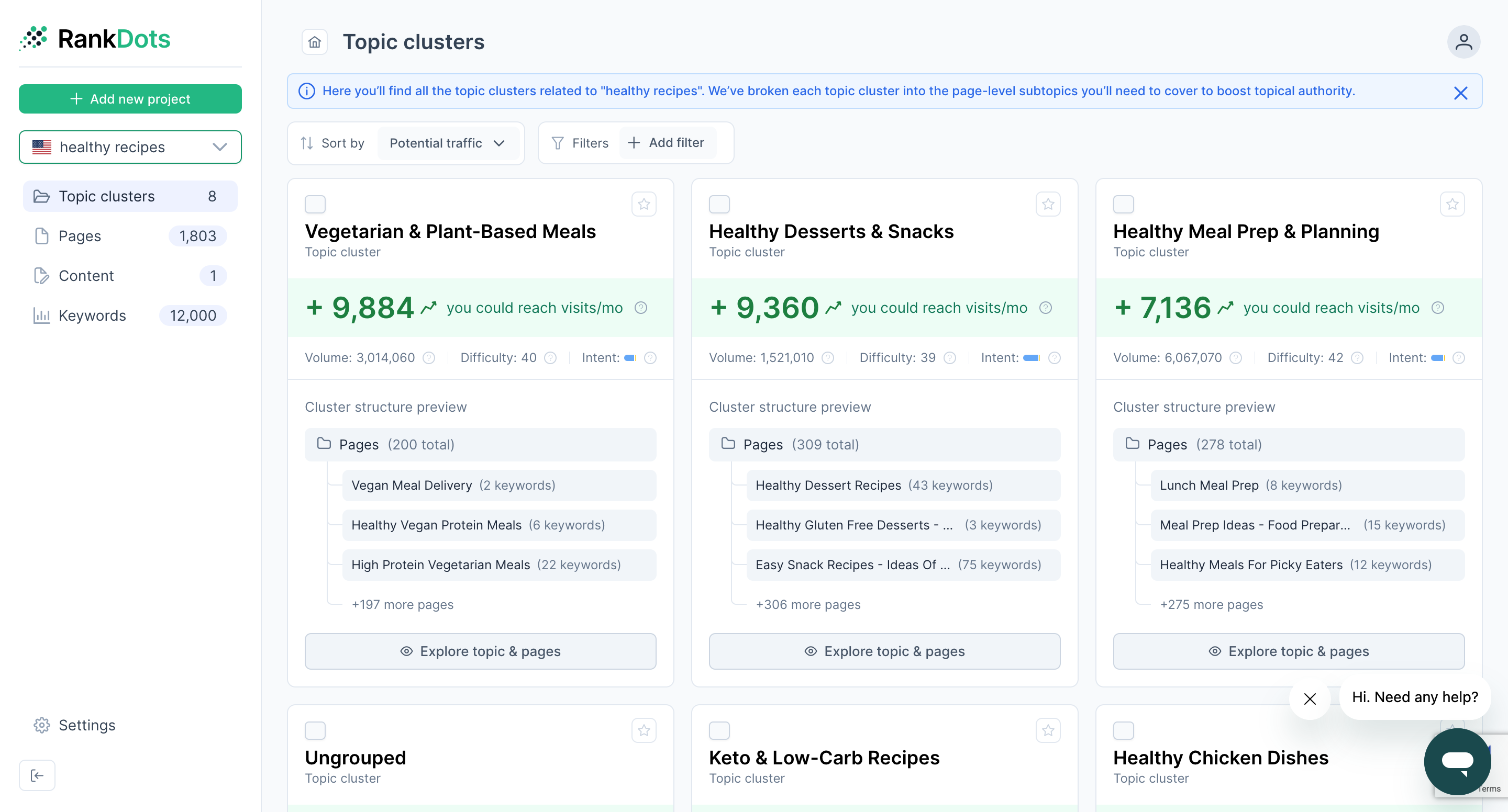 Each topic cluster in RankDots appears as a card with key metrics, including topic difficulty.