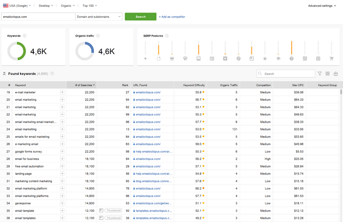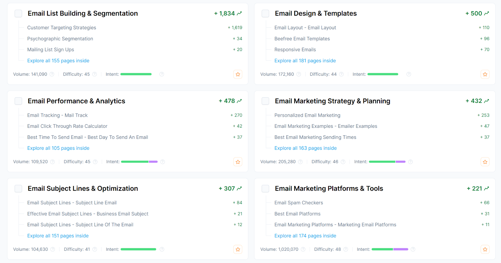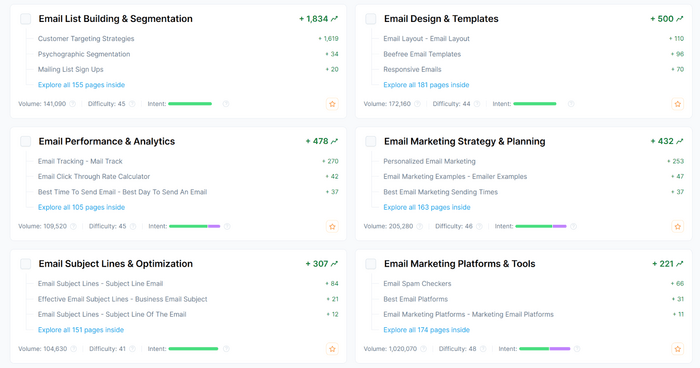 For example, when I researched the topic ecommerce email marketing, I got a range of ideas such as email list building, email performance and analytics, email design and templates, email marketing strategy, email automations, and more.