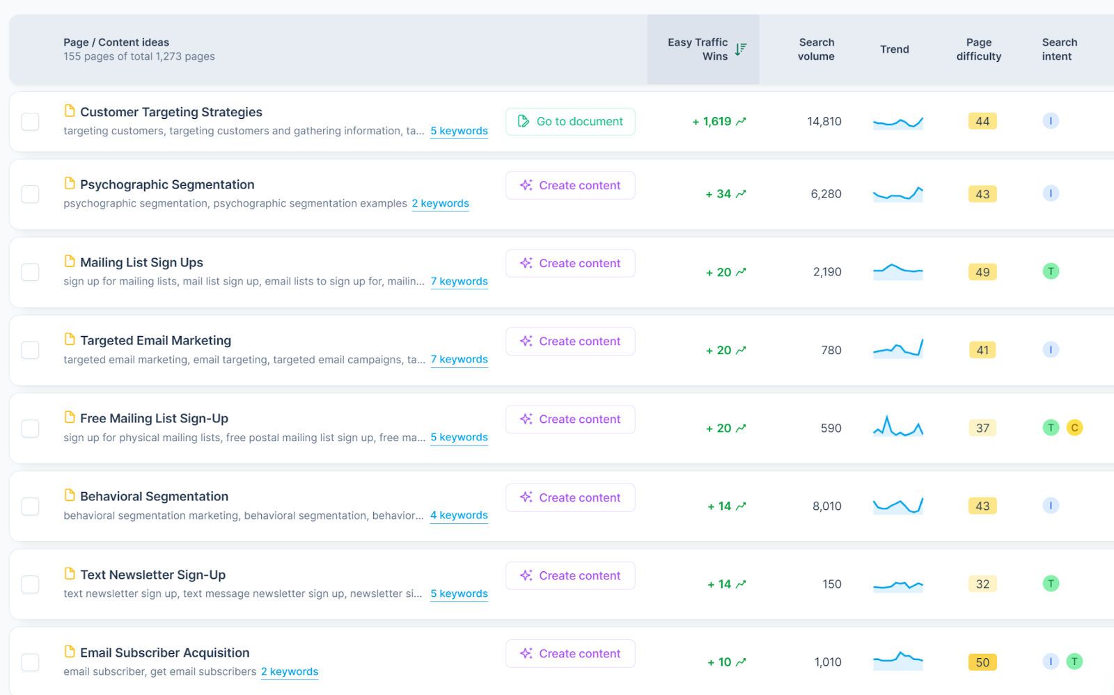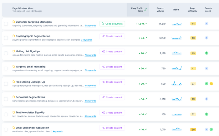 Not sure which topic or keyword to tackle first? A good rule of thumb is to focus on the ideas with the highest Easy Traffic Wins score. This metric highlights the keywords where ranking is realistically achievable because competitors aren’t heavily optimized. If you rely only on search volume, you may end up choosing keywords that are extremely competitive and difficult to break through.
