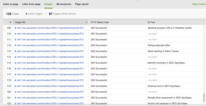 If you’re unsure whether your site has gaps here, it’s worth reviewing your existing alt texts. You can do this quickly in WebSite Auditor. Just create a project, let it crawl your site, and check the Images dashboard under Site Structure > Pages to spot missing or weak alt attributes.