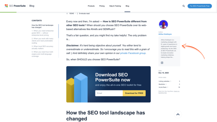 Feature expert bylines, bios, and external citations to reinforce trust signals. Authority isn’t just about backlinks anymore—it’s about who is writing and why they’re credible.